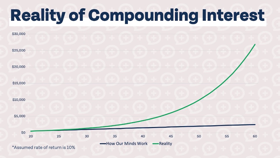 If you start with $500 at age 20, you might have $1,000 by age 30, $1,500 by age 40, $2,000 by 50, and $2,500 by age 60. Turning $500 into $2,500 sounds pretty great! But the reality of compounding interest is much more exciting.