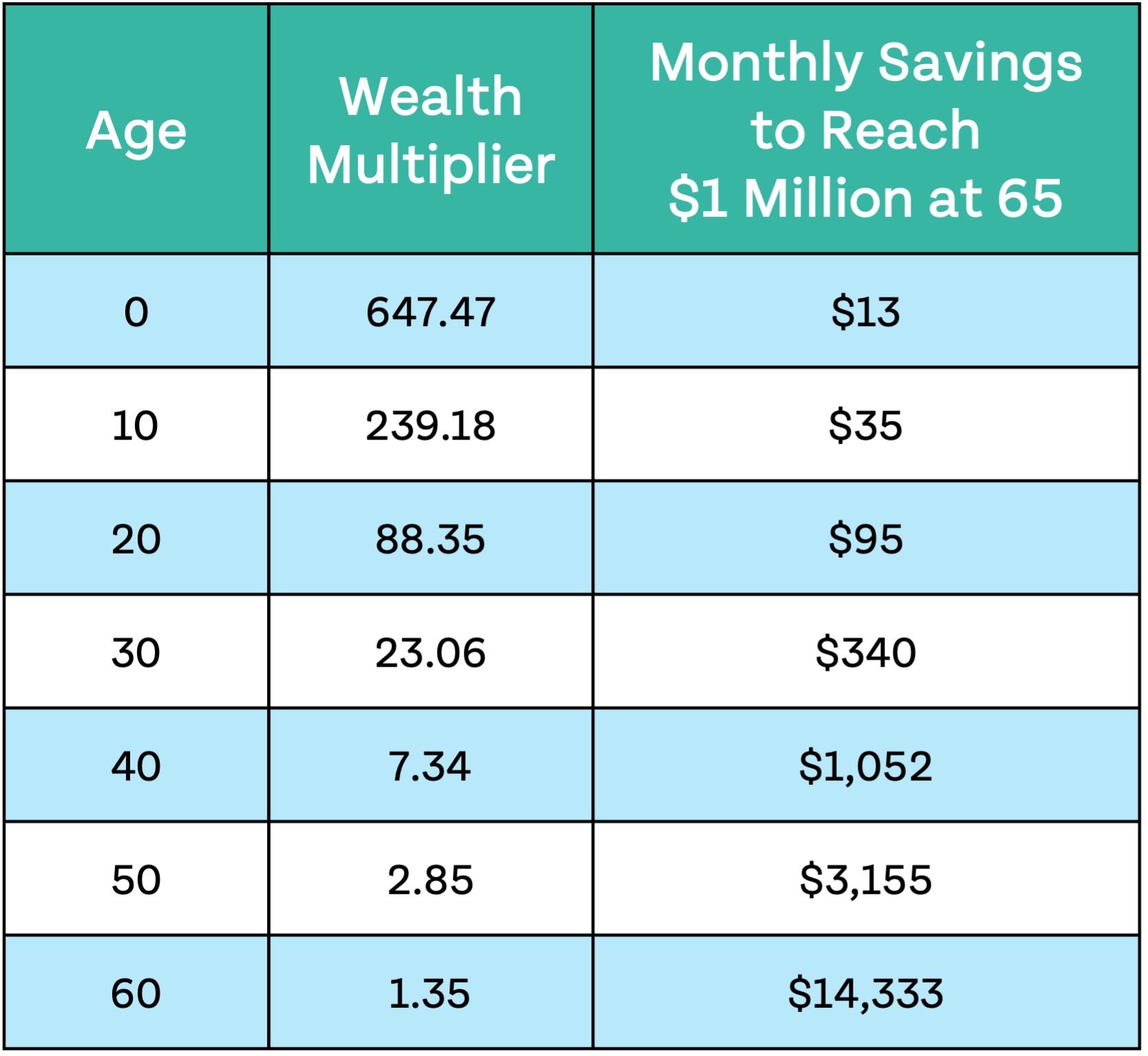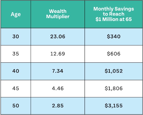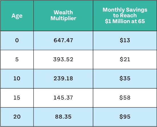 Not everyone starts investing early in life, but this is when your dollars are the most powerful. Check out the table below to see the Wealth Multiplier values and monthly investing needed to reach $1 million for ages 0 to 20.