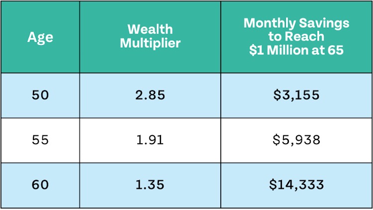 While your Wealth Multiplier isn’t as powerful as it was in your 20s, investing more now can help you catch-up, stay on-track, or build your life of abundance.